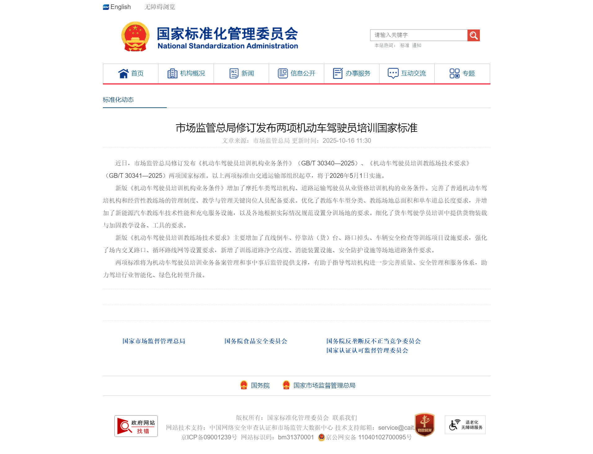 近日,市场监管总局修订发布《机动车驾驶员培训机构业务条件》(GB/T 30340—2025)、《机动车驾驶员培训教练场技术要求》(GB/T 30341—2025)两项国家标准。以上两项标准由交通运输部组织起草,将于2026年5月1日实施。
